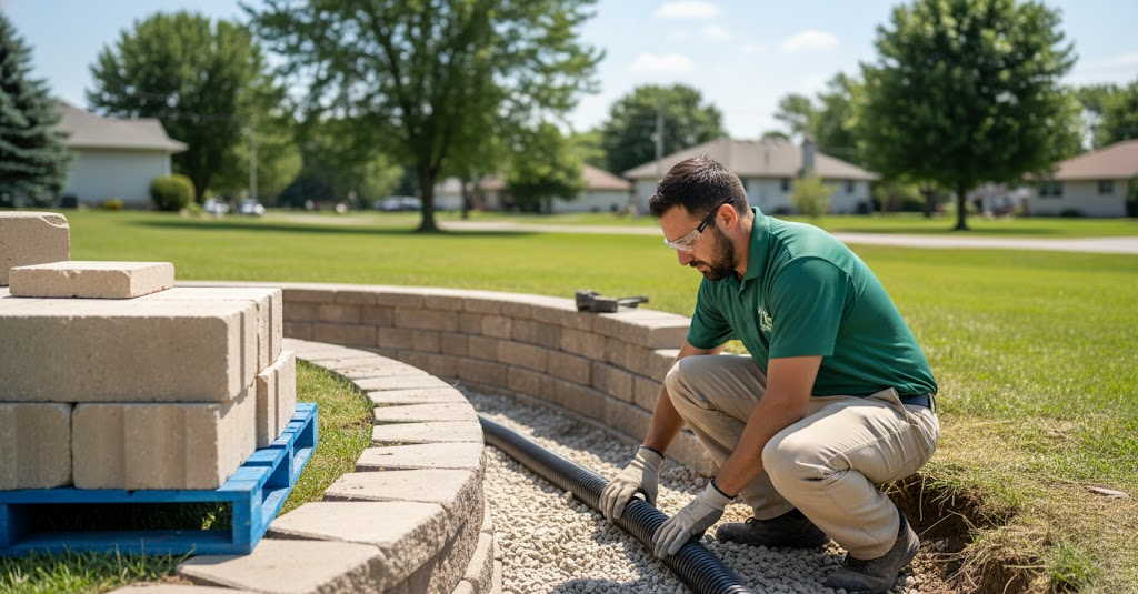 Drainage is essential for retaining wall longevity and we install drainage fabric, gravel layers and piping to prevent soil pressure buildup.