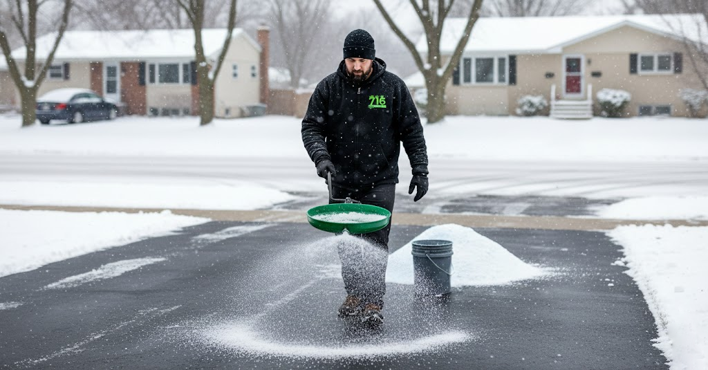 We apply salt treatments that help reduce ice buildup and keep driveways and walkways safer during freeze thaw cycles.